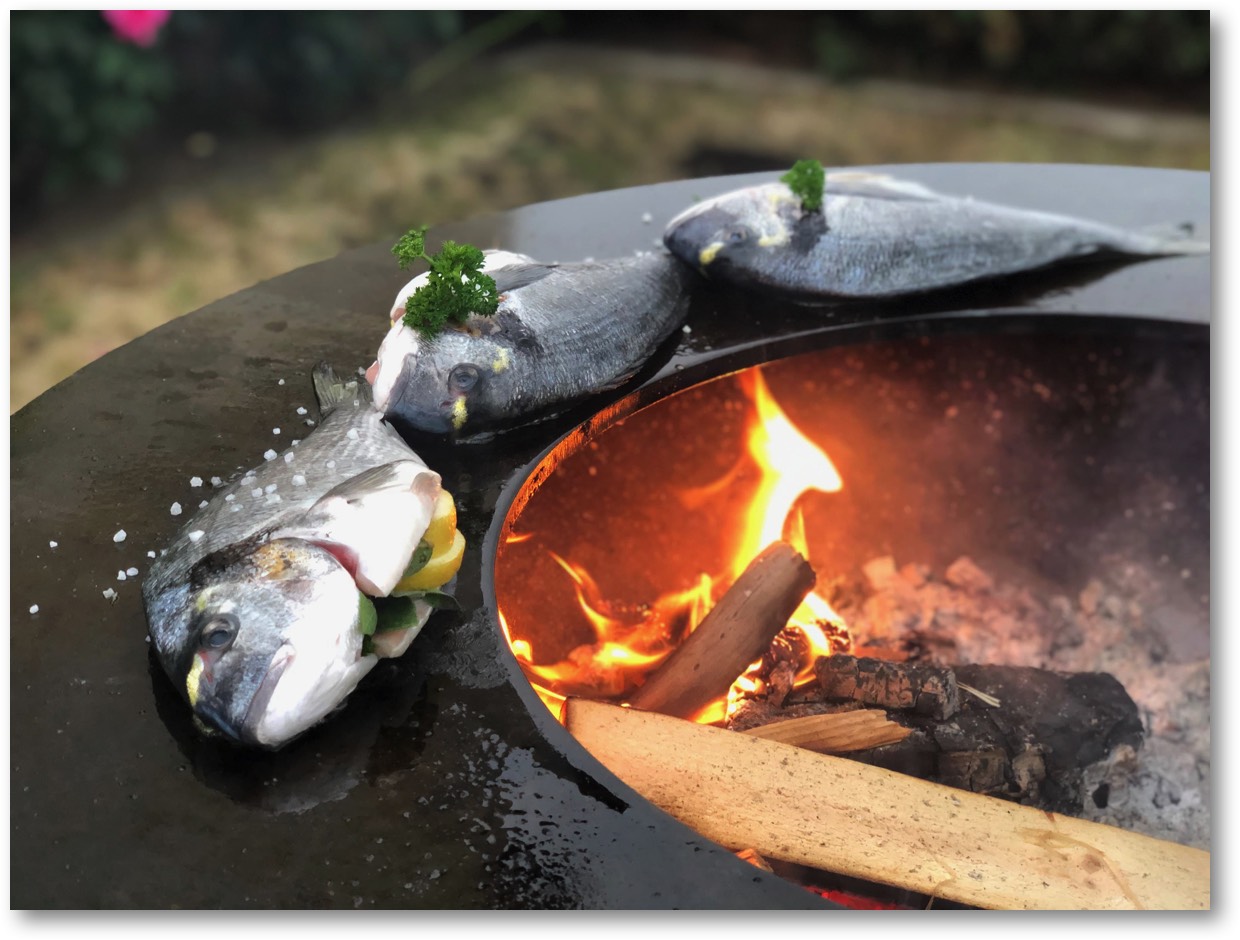 Im Freien Braten, Grillen, Kochen - mit der Kamin-Schulze-Ofyr-Outdoor-Grill-Feuerschale.